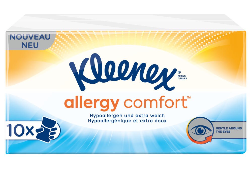Kleenex Allergy Comfort Tissues zijn vrij van parfum, lotion en kleurstoffen, waardoor ze geschikt zijn voor de gevoelige huid. Deze zachte en absorberende tissues bieden extra verzorging voor de omgeving rond de ogen, neus en het gezicht. Ze zijn ideaal voor mensen die last hebben van een loopneus en geïrriteerde ogen als gevolg van allergieën. Bovendien zijn de Kleenex® Allergy Comfort™ tissues dermatologisch en ophthalmologisch getest. Deze verpakking bevat 10 handige kleine verpakkingen voor onderweg, op reis of voor in de auto.Kleenex Allergy Comfort Tissues:Dermatologisch en ophthalmologisch getestSpeciaal voor mensen met allergieënVrij van lotion, parfum, kleurstoffenBijzonder zacht en absorberendBevat 10x kleinverpakkingHypoallergeen