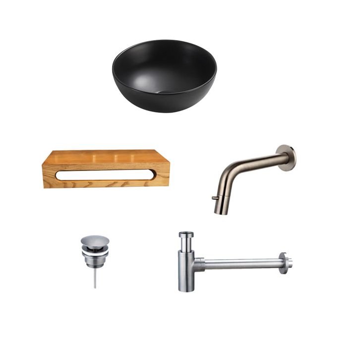 Zwarte Ronde Keramische Wastafel met Houten Plank, Bronzen Kraan, Afvoer & Sifon - 40x22x8 cm
