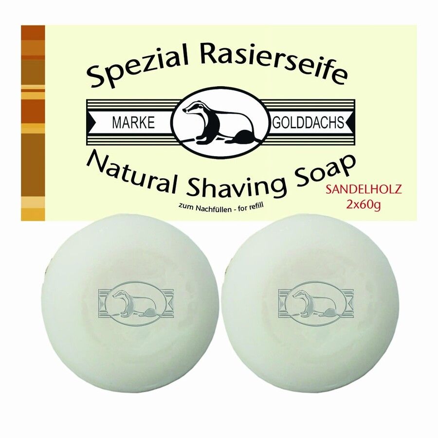 Scheerzeep, sandelhout, in een navulverpakking van 2 GOLDDACHS scheerzepen met zijn unieke geuren en zijn voedende ingrediënten bereiden de huid en het haar voor op optimaal scheren. Door het fijne, romige schuim kan het lemmet gemakkelijk om over de huid en het haar te glijden, waardoor een gladde en langdurige scheerbeurt ontstaat, die meer dan 8 uur kan duren. De speciale formulering van GOLDDACHS scheerzeep verwent je huid. Geschikt voor gevoelige huid. Alle verzorgingsproducten zijn MADE IN GERMANY. Deze geur heeft een kalmerende werking en stimuleert de geest. De warme en fluweelachtige tonen van deze geur garanderen een ontspannen start van je dag. Het houtachtige-balsamico sandelhout is ideaal voor dagelijks gebruik met een aangename geur.