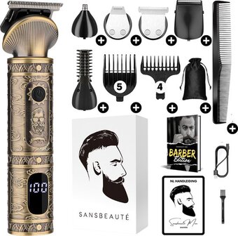 Op zoek naar een tondeuse en baardtrimmer in 1 waarmee je het kapsel en je baard kunt trimmen, scheren en eindeloos kunt stijlen in verschillende modellen? Dan is de Sansbeauté® Tondeuse Baardtrimmer | Gold Edition een perfecte investering voor jou! Dit model is voorzien van 9 (!) kwalitatieve opzetkammen waarmee je het haar makkelijk kunt stijlen in verschillende lengtes! Met de 6 verschillende opzetstukken heb je in één klap alle benodigdheden in huis, dus ook financieel aantrekkelijk! Door de verwerking van een LED-display kun je nu makkelijk aflezen wanneer je moet reinigen en opladen! Door de krachtige accu kun je maar liefst 3 uur lang trimmen zonder onderbrekingen! Ook is de kop volledig waterproof waardoor een snelle reiniging onder de kraan een feit is! En als kers op de taart krijg je er ook nog een opbergzak, e-book met waardevolle tips en een kam bij! Dus waar wacht je nog op? Investeer nu in de Sansbeauté® Tondeuse Baardtrimmer en geniet elke dag van een perfecte look!
