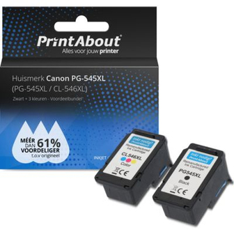 Met de Huismerk Canon PG-545XL / CL-546XL Inktcartridge Zwart + 3 kleuren Voordeelbundel Hoge capaciteit bespaar je direct op jouw printkosten. De Huismerk Canon PG-545XL / CL-546XL Inktcartridge Zwart + 3 kleuren Voordeelbundel Hoge capaciteit bevat meer inkt ten opzichte van het origineel. Hierdoor dalen jouw printkosten aanzienlijk. Je bespaart in totaal 61% per afdruk ten opzichte van de originele inktcartridges. Eigenlijk krijg je dus standaard korting als je kiest voor het PrintAbout huismerk.