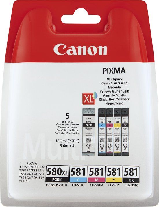 De Canon PGI-580XL & CLI-581 multipack met vijf cartridges bevat één zwart, cyaan, magenta en geel en een zwarte-pigment XL inktcartridge voor het printen van documenten en foto's van zeer hoge kwaliteit.