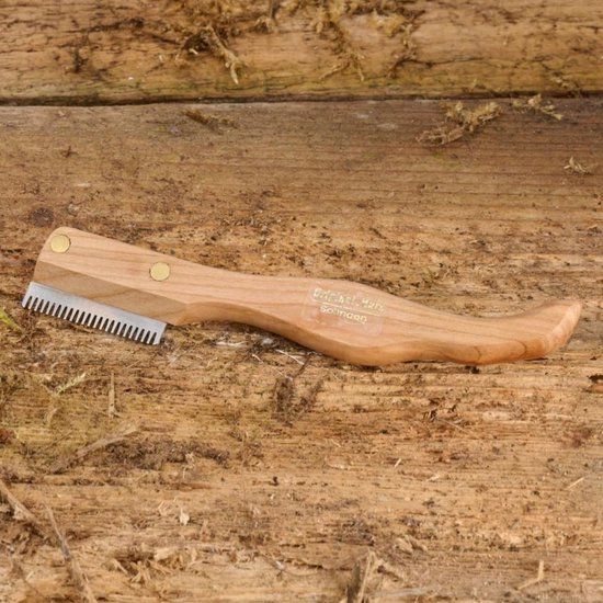 Deze trimmer is voorzien van roestvrijstalen bladen met een gemiddelde vertanding die ideaal is voor algemeen werk op het hele lichaam. De bladen zijn gehard en daarna pas getand, waardoor ze 100% schoon en vrij van schaalresten zijn. Dit zorgt voor een soepele werking en effectieve trimresultaten. Het ergonomische handvat is gemaakt van lokaal kersenhout en is ontworpen om comfortabel in de hand te liggen, wat langdurig gebruik zonder vermoeidheid mogelijk maakt.