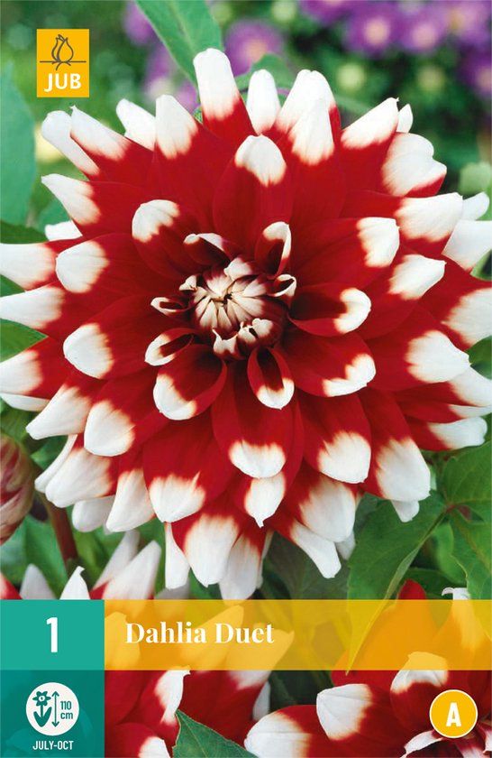 De grootbloemige, decoratieve dahlia ‘Duet' is een dankbare zomerbloeier die u maandenlang plezier geeft. Dahlia 'Duet' bloeit de hele zomer van juli tot de eerste nachtvorst. Dahlia 'Duet' wordt ongeveer 90-110 cm. hoog. Soms is het nodig om de bloemstengels te steunen. Dahliaknollen kunt u in het voorjaar planten. Dahlia 'Duet' is vorstgevoelig, pas dus wel op met late nachtvorst. Graaf een ruim plantgat, maak de aarde los en vul het plantgat met goede potgrond. Leg de knollen voorzichtig in het plantgat en dek af met 3-5 cm. aarde. De plantafstand van de knollen is 30-60 cm. Geef na het planten de knollen meteen wat water. dahlias bloeien het rijkst in de volle zon. Bewaar de knollen na de bloei op een vorstvrije plaats en u heeft er jarenlang plezier van. Dahlia 'Duet' is goed te combineren met vaste planten en andere dahlia soorten. De rood met witte bloemen zijn echte blikvangers in de border. Dahlia ‘Duet’ is ook een uitstekende snijbloem en lang houdbaar op de vaas. Het beste tijdstip om dahlias te snijden is vroeg op de dag. Zet de stelen direct in lauwwarm water met snijbloemenvoedsel.