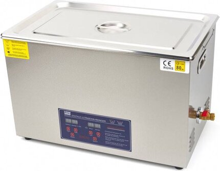 De HBM 30 Liter Professionele Ultrasoon Reiniger reinigt met gemak de meest hardnekkige vuile oppervlakken. Ultrasoon reinigen is een mengvorm van chemisch en mechanisch reinigen. Ultrasoon reinigen is zeer geschikt om grondig te reinigen op plaatsen die moeilijk of niet bereikbaar zijn, zoals holtes, ruwe oppervlakken, inwendige kanalen of de binnenkant van buisjes. De maximale vloeistof vulinhoud van het bad is 26,2 Liter.