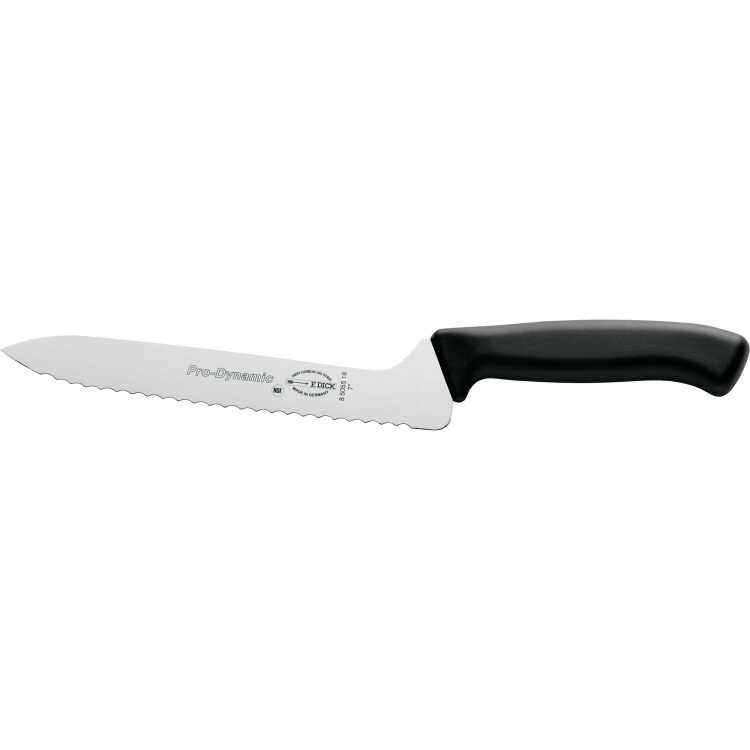 Het ProDynamic broodmes 85055182 van DICK heeft een schuin lemmet met een gekartelde rand voor het gemakkelijk bereiden van broodjes en sandwiches. Het schuine lemmet maakt het mogelijk snel en soepel broodjes en baguettes te snijden zonder dat de hand de snijplank raakt. De messen uit de ProDynamic-serie worden gebruikt in de horeca, grote keukens en in de keuken thuis. Ze onderscheiden zich door hun lage gewicht en maken langer werken zonder vermoeidheid mogelijk. Het ergonomisch gevormde volledig kunststoffen handvat en het hoogwaardige roestvrijstalen lemmet resulteren in een modern mes met een strak design.