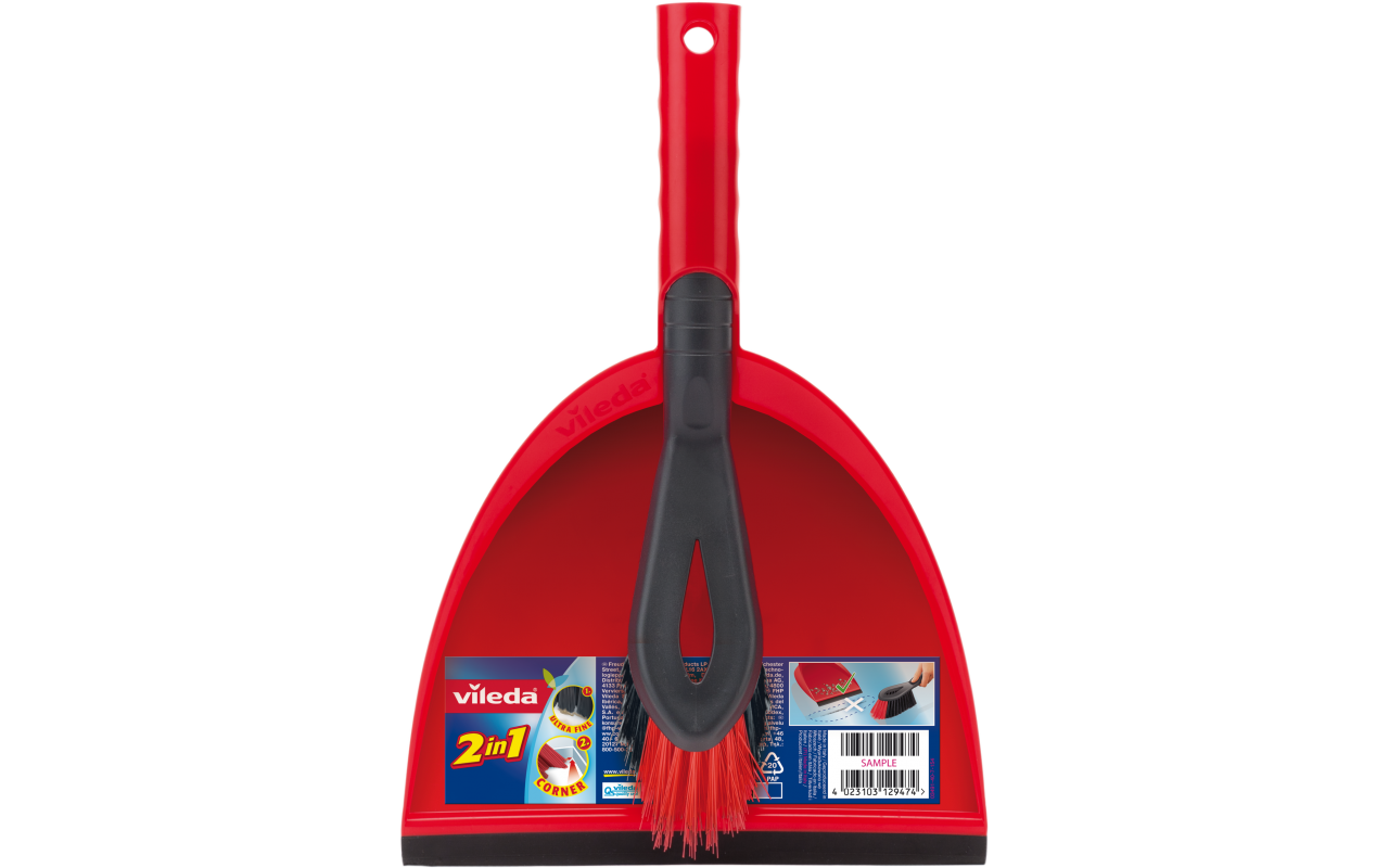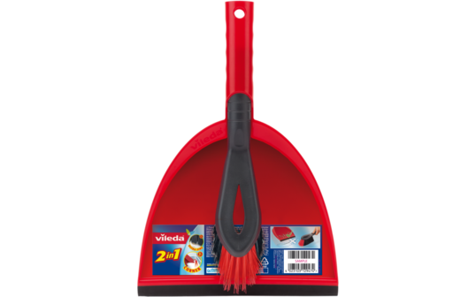 The Vileda 2 in 1 Dustpan and Brush is designed to make sweeping the floors easier\n\nThe flexible rubber lip helps mold the pan edge to uneven floor surfaces for more effective dust pick up.\n\nThe brush is made from 2 types of bristles; 1. Black bristles for fine dust, particles and hairs 2. Red angled bristles for effective corner cleaning.\n\nThe brush nestles into the pan for easy storage when not in use.