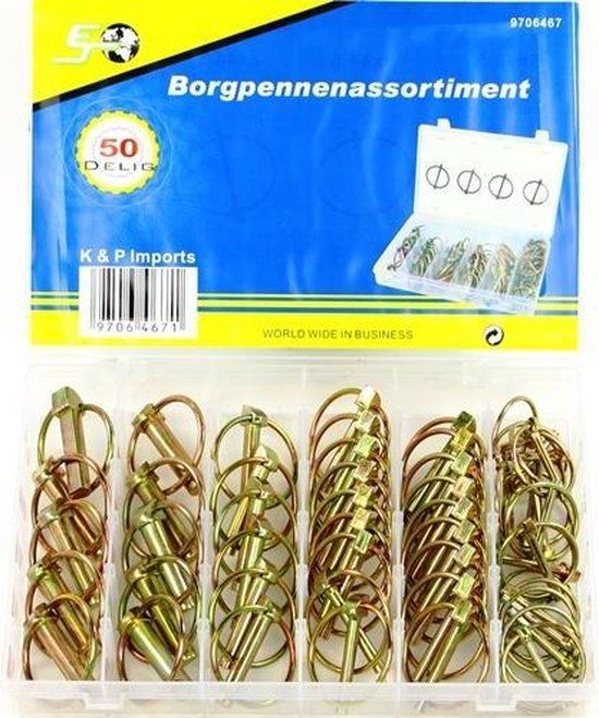 Goed gesorteerde doos met borgpennen in courante maten.