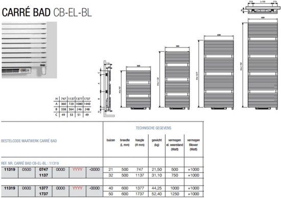 Vasco Carre cb-el-bl elektr.radiator m/blower 500x747 n50 1500w, wit ral 9016 - Verwarmingsradiatoren