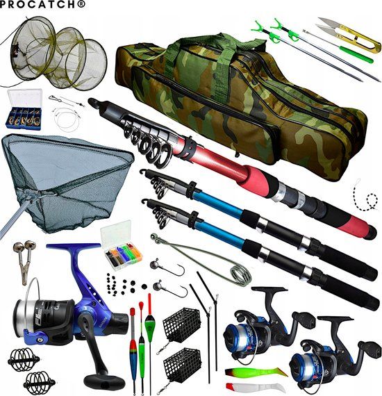 Dankzij de Vishengelset van ProCatch® beschik je over een complete set, waarmee je rechtstreeks naar de waterkant kunt gaan om te vissen! De set van ProCatch® is de perfecte set voor de gevorderde, beginnende of -gelegenheidsvisser en voor iedereen die wil kennismaken met de hengelsport. De ProCatch® hengelset is een ‘ready-to-fish’ set; deze set bevat drie telescopische hengels, visvoer (mais), drie werpmolens, vislijn, onthaker en nog veel meer!
