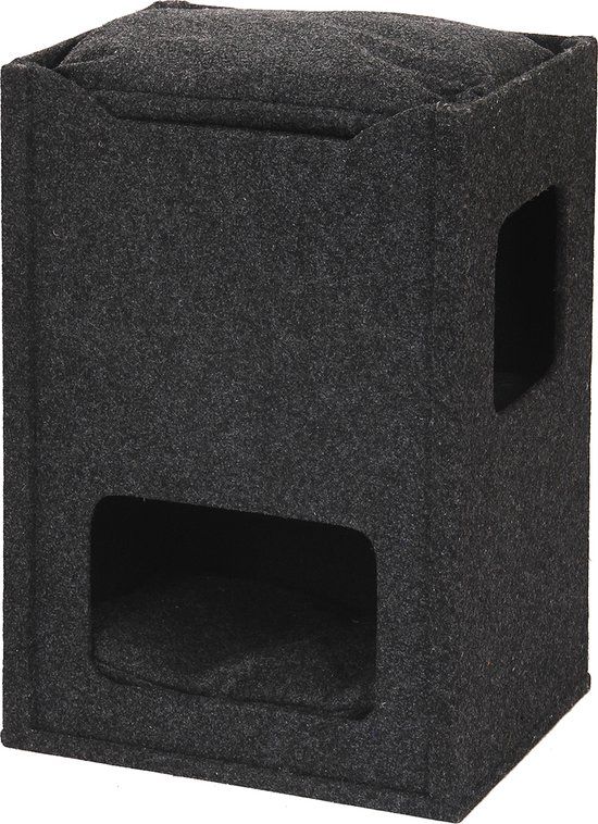 De grijze Ebi Krabpaal comfort cuby combineert stijlvol design met functionaliteit. Deze krabpaal, 48cm breed, 38cm diep en 70cm lang, brengt een touch van elegantie in je interieur dankzij het hoogwaardige vilt. Het biedt je kat verschillende voordelen. Ten eerste is er de mooie, grote sisal kraboppervlakte. Met deze natuurlijke stof kan je kat perfect zijn nagels scherpen zonder je meubels te beschadigen. Daarnaast vind je in de krabpaal twee rustige schuilplaatsen. Deze schuilplaatsen zijn voorzien van zachte kussens en meerdere ingangen, ideaal voor een dutje of simpelweg om te ontspannen. Als je kat het liever hogerop zoekt, biedt de bovenkant van de krabpaal nog een extra comfortabel liggedeelte. Van hieruit kan de kat zijn omgeving perfect in de gaten houden. De krabpaal wordt compact verpakt en is makkelijk in elkaar te zetten. Een doordachte keuze voor elke kattenliefhebber die meubilair wenst te beschermen en tegelijk de eigen kat een comfortabele plek biedt.