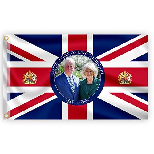 King's Coronation Decoration: Vier King's Coronation met onze exclusief ontworpen union jack vlag met HM King Charles III met Camilla Parker Queens Consort & National Emblem of Great Britain. Gemaakt ter herdenking van de toetreding van koning Karel III in Engeland. Deze koning Charles III Britse vlag is het perfecte royaltycadeau of cadeau voor fans van de koninklijke familie. Materiaal: gemaakt van 100% polyester met felle kleuren. De kleur is scherp en levendig en de kleurstof is verwerkt Voor UV Fade resistant. Versier je huis, tuin, kantoor, gebouwen met deze geweldige vlag. Grootte: 152cm x 91cm (5' x 3'). Versterkt met twee oversized messing doorvoertules voor eenvoudig ophangen. King Charles kroningsvlag kan binnen en buiten worden gebruikt. Eenvoudige installatie en demontage. Veel gebruikt: Geweldig als cadeau om te koesteren voor vrienden en familie of toegevoegd aan een verzameling souvenirs van onze geweldige koning. Grote Britse vlag voor Union Jack-feest, straatfeest, King"s kroningthemafeesten en gemenebestspellen.
