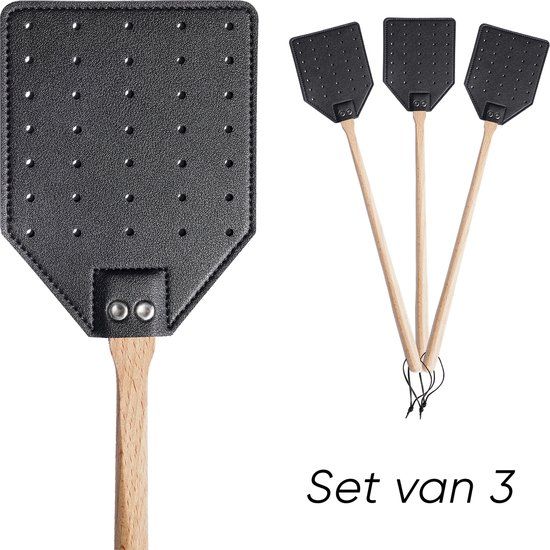 Woonzinnig Vliegenmepper - Leer - Hout met Ophanglus (Set van 3) - Zwart/Hout