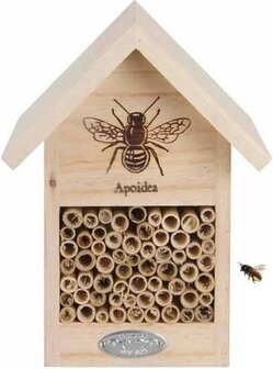 Een insecten hotel huisje voor bijen. In dit bijen hotel kunnen de insecten uitrusten/overwinteren. Afmeting: ca. 17 x 12 x 23 cm. Materiaal: vurenhout/bamboe. Met ophangoogje. Dit diervriendelijke tuindecoratie accessoires bijenhuis/bijenhotel/wespenhotel draagt bij aan het ecosysteem en de biodiversiteit in uw tuin. Een habitat voor bestuivers. Het insectenhotel is een must-have voor tuinliefhebbers/natuurliefhebbers.