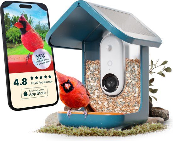 Leg kristalheldere close-ups van vogels vast met de Bird Buddy 2.0 Smart Bird feeder with solar panel. Nu met een uitgebreid gezichtsveld en slow-motion video.