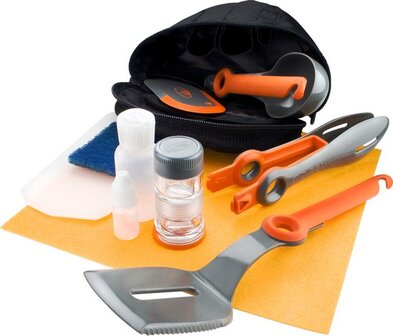 Integrated 12 piece kitchen set has every utensil for a gourmet backpacking trip neatly organized into a lightweight tote that keeps everything organized and nests within the nFORM Crossover System Cooksets.\n\n- Pivoting high temperature Nylon 66 Spatula and Spoon with graduations tools rotate from stored to working position.\n- Waterproof Ultralight Salt + Pepper shaker modules screw together to keep spices dry and flavorful.\n- Includes cutting board, camp towel, compact scrapper, liquid soap dispenser and scrubbing pad for quick clean-ups.