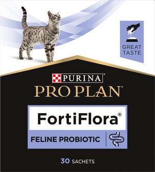 - VoedingsadviesEr wordt aanbevolen gedurende 30 dagen één zakje Purina Pro Plan FortiFlora Feline Probiotic per dag over het normale voer te strooien. Het kan ook over een langere periode worden gegeven. Feline FortiFlora is ook veilig voor jonge kittens en drachtige en zogende katten. Wanneer Feline FortiFlora wordt gegeven om de intestinale microflora-balans te herstellen vanwege antibioticum-gebruik
