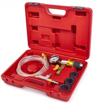 Hoe de set precies in zijn werk gaat? Bij het afpersen en vullen wordt er gebruikt gemaakt van een vacuüm pomp. Op deze manier kunnen er geen luchtbellen in het systeem ontstaan. Het geheel wordt ook nog eens geleverd in een erg handige transport koffer. Daarnaast blijft de set extra goed op de juiste plek dankzij de voorgevormde inlay van kunststof. Ook wordt de veiligheid extra gewaarborgd door de clips waar je de koffer mee vast kunt maken. Dit voorkomt schade aan de set tijdens het transport naar een externe werklocatie. Door middel van het heldere analoge display lees je de meting eenvoudig en snel af.