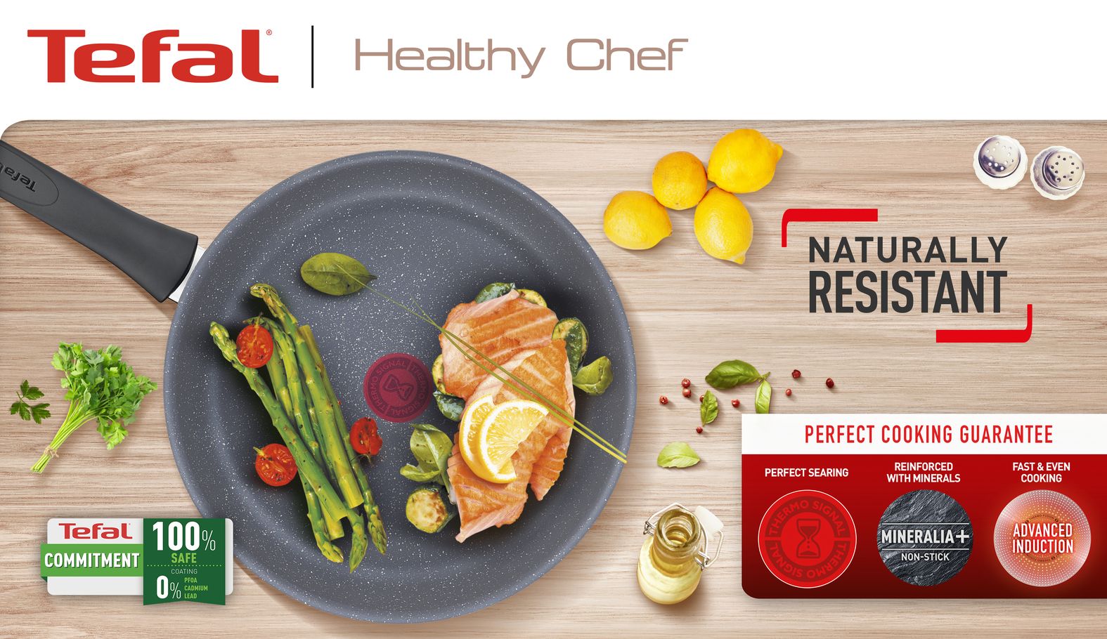 Ontdek Healthy Chef, de nieuwe onmisbare koekenpan is geschikt voor alle warmtebronnen, inclusief inductie. De Mineralia + coating is verrijkt met met natuurlijke mineralen. Hierdoor is je pan extra krasbestendig en gaat je pan lang mee. Dankzij de Thermo-Signal™ weet je wanneer je pan heet genoeg is, zodat je perfect krokante resultaten behaald met een malse binnenkant, zonder extra vetten te gebruiken. De stonelook geeft de pan een robuuste en stevige uitstraling en staat goed in iedere keuken.