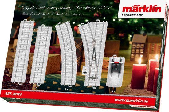 Speciale aanvulset voor de Märklin kerstset 29124. Met "besneeuwde rails". 2 rechte rails 171,7 mm, 2 rechte rails 188,3 mm, 1 gebogen rail (tegenboog voor wissel), 1 wissel links en 1 stootblok