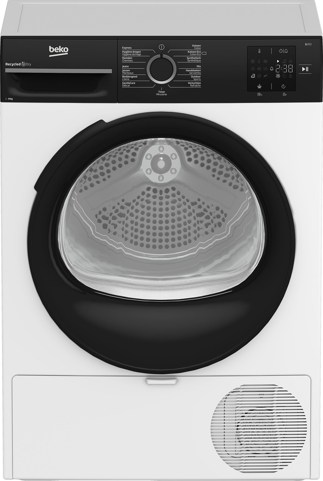 De trommel is geschikt voor maximaal 8 kg droog wasgoed (gewicht van kleding in droge toestand). Dat biedt ruimte voor middelgrote ladingen, zoals dagelijkse kleding en handdoeken. Voor optimale resultaten laadt u de trommel gelijkmatig en niet te vol, zodat lucht en warmte goed kunnen circuleren door de vezels.