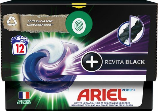 Onberispelijke reiniging +Revitablack: Ariel PODS+ wasmiddelcapsules hebben nu een extra paars vak en vernieuwen de glans van zwart en donkere kleuren Ontdek Ariel PODS+ vloeibare wasmiddelcapsules +Revitablack. Ze hebben nu een extra paars vak en vernieuwen de glans van zwart en donkere kleuren. Ze zijn gemaakt in Frankrijk en ontworpen voor koud water met de unieke COOL CLEAN-technologie. Bij contact met water lost het laagje op om krachtige vlekverwijderende technologieën vrij te geven en Ariels diepe en sterke reiniging van PODS+ Touch of Lenor Unstoppables Color te bieden. Daarnaast kunnen de Ariel wastabletten nu helpen plastic te verminderen dankzij hun recyclebare ECOCLIC-kartonnen doos. Het is gemaakt met 70% gerecyclede vezels en bevat maximaal 5% plastic, ontworpen om je PODS te beschermen Let op: Dit product kan schadelijk zijn en ernstige verwondingen veroorzaken. Houd de Ariel PODS+-wasmiddelcapsules altijd buiten het bereik van kinderen. Bezoek keepcapsfromkids.eu voor meer informatieVoordelen en kenmerken• Geproduceerd in Frankrijk: Ariel wasmiddelcapsules worden geproduceerd in Frankrijk• 100% in water oplosbaar PODS-laagje: Ariel wasmiddel PODS hebben een volledig in water oplosbaar PODS-laagje• Ontworpen voor koud water: Ariel All-in-1 PODS wasmiddelcapsules met COOL CLEAN-technologie• Was kouder met Ariel PODS en help CO2 te besparen: Koud wassen helpt om elektriciteit en dus CO2 te besparen. Het helpt -stoffen ook langer te beschermen (in vergelijking met wasprogramma's met warm water)• ECOCLIC kartonnen doos: Zorg voor minder plastic met Ariel All-in-1 PODS-wastabletten, nu in een recyclebare kartonnen doos die gemaakt is met 70% gerecyclede vezels en maximaal 5% plastic, ontworpen om je PODS te beschermen• Ontdek de ARIEL PODS+-collectie met Ultra Vlekkenverwijdering, Actieve Geurbestrijding, Touch of Lenor Unstoppables, Extra Vezelbescherming• Geweldig voor reiniging: Ariel All-in-1 PODS altijd buiten het bereik van kinderen houden. Bezoek keepcapsfromkids.eu voor meer informatie
