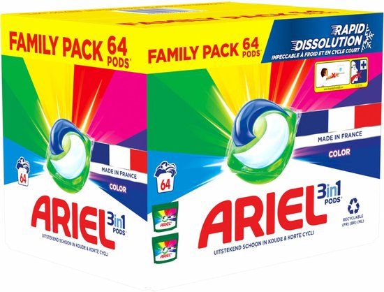 Ariel 3in1 Pods Color lost snel op, zelfs in koud water, en levert onberispelijke resultaten bij koude en korte programma's. Was kouder met Ariel Pods: kouder wassen helpt om elektriciteit te besparen. Het helpt je stoffen en kleuren ook langer te beschermen (in vergelijking met wasprogramma's met warm water). Ariel Pods worden ook in Frankrijk gemaakt. Bij contact met water lost de 100% in water oplosbare Pods filmlaag volledig op om krachtige vlekverwijderende technologieën vrij te geven. Ariel 3in1 Pods Color biedt een diepe en sterke reiniging. De Ariel Pods worden geleverd in een recyclebare verpakking. WAARSCHUWING: dit product kan schadelijk zijn en ernstige verwondingen veroorzaken. Houd de Ariel 3in1 Pods altijd buiten het bereik van kinderen. Bezoek keepcapsfromkids.eu voor meer informatie.