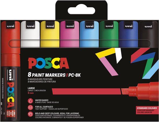 POSCA paintmarker PC-8K | 8 mm | etui van 8 stuks in basiskleuren - Waterverfkleurkrijtjes
