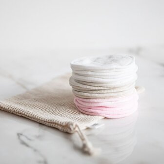 – 6 scrub pads (80% bamboe, 20% katoen) - verkrijgbaar in drie kleuren: roze, beige en wit of in een mix
