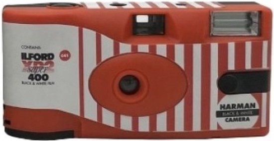 Deze Ilford wegwerpcamera is voorgeladen met zwart/wit Ilford XP2 super iso 400 27exp film en biedt fijnkorrelige foto's met hoog contrast.