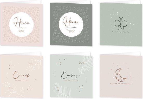 Deze set bestaat uit 6 verschillende dubbele wenskaarten om iemand te feliciteren met de geboorte van hun zoon of dochter. De kaarten hebben een blanco binnenzijde.