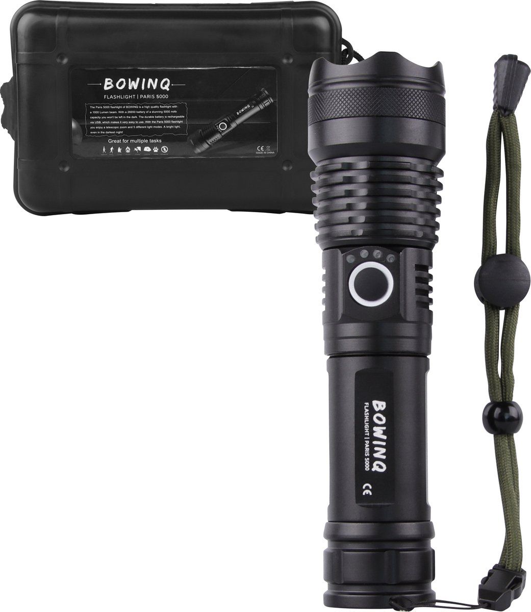 BOWINQ - Zaklamp LED oplaadbaar - 5000 mAh - Opbergkit - IP65 - Zwart - Koplampen