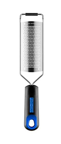 Moeiteloos raspen van citrusvruchten, harde kaas, chocolade, knoflook, noten, gember en specerijen Scheurt de levensmiddelen niet, verbetert het aroma en de smaak Messen van roestvrij staal van goede kwaliteit en lange levensduur Antislip uiteinden voor meer veiligheid Ergonomische handgreep in zwart en blauw